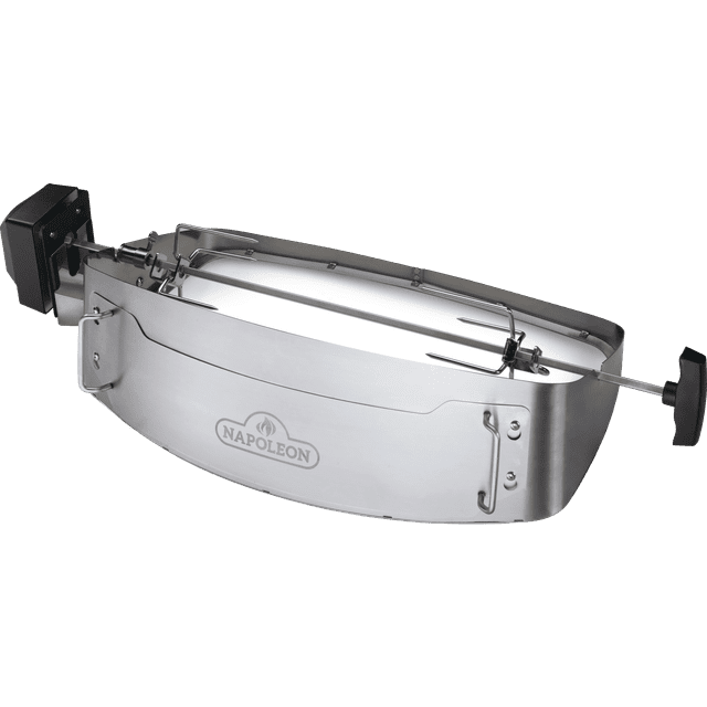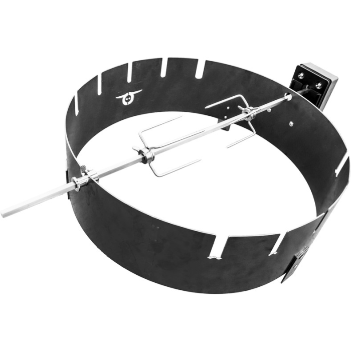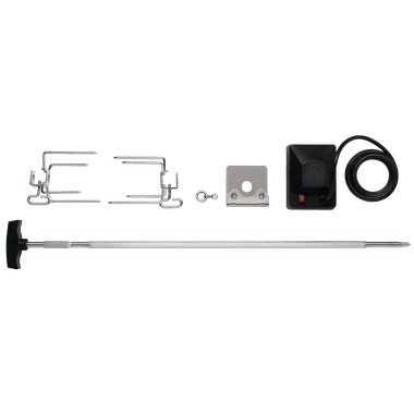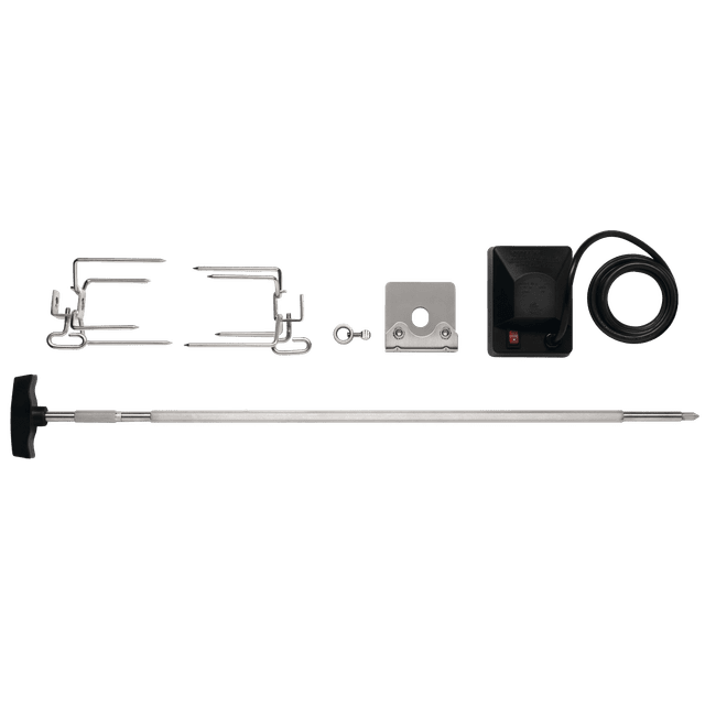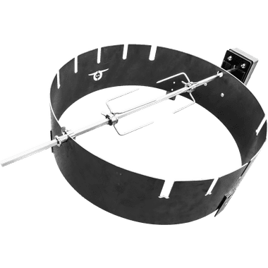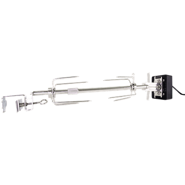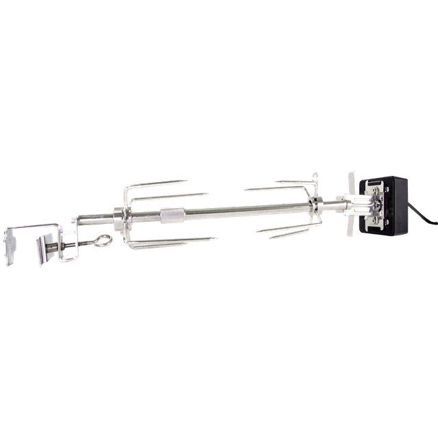 De BarrelQ Notorious Big Rotisserie is een handige accessoire waarmee je grote braadstukken of gevogelte met weinig moeite goed gaar krijgt. Deze uitbreiding van de Notorious Big barbecue is een draaispit met een elektrische motor, dus draait het vlees automatisch. Je plaatst stalen verhogingshaken op je barbecue, waar je de rotisserie eenvoudig in schuift. Vervolgens zorgt het apparaat dat je vlees aan alle kanten goed gaar is.