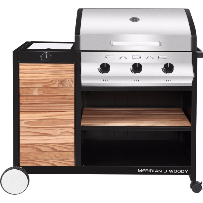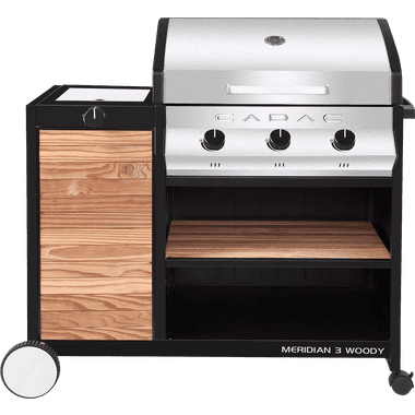 Met de Cadac Meridian Woody haal je een complete buitenkeuken in huis. De barbecue beschikt over 3 hoofdbranders en een zijbrander voor het verwarmen van sauzen en bijgerechten. Je hebt genoeg plek om voor 14 personen te grillen op het kookgedeelte van 48 x 63,5 centimeter. Dankzij het modulaire systeem breid je de barbecue uit met meerdere kookoppervlakken, bijvoorbeeld met de Cadac pizzasteen (niet meegeleverd). Is een deel van je gerechten al klaar? Dan houd je deze warm op het warmhoudrooster tot je het aan je gasten serveert. Van afdruipend vet heb je geen last. Het vet loopt schuin af in een gemakkelijk uitneembaar vetopvangbakje waardoor je barbecue snel schoon is.